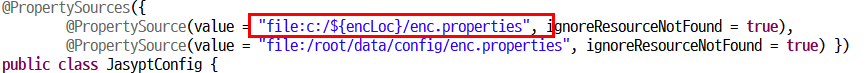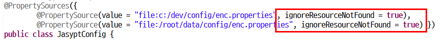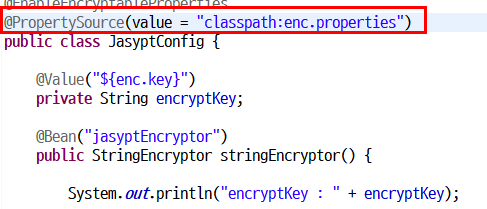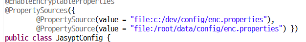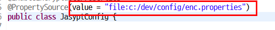 그래서 저희는 enc.properties 안에 있는 프로퍼티속성들을 JasyptConfig 클래스가 실행될때 읽도록 설정을 해주어야 합니다.