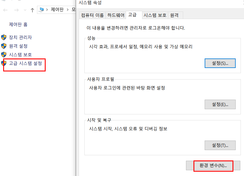 내 컴퓨터에서 오른쪽 버튼 클릭 -> 속성 -> 고급 시스템 설정 -> 환경변수로 진입합니다.