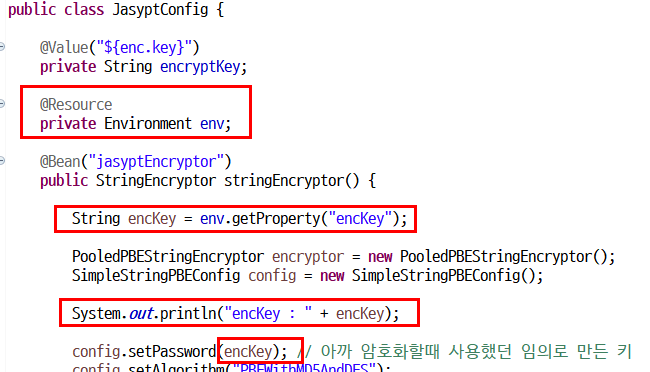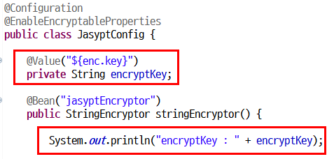JasyptConfig.java에 아래와 같이 추가해줍니다.