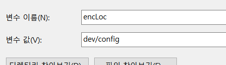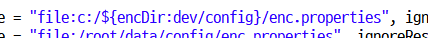 encDir는 제가 등록하지 않은 환경변수입니다. 환경변수의 값이 없으면 : 뒤에 부분, 즉 여기서는 dev/config를 사용하라는 의미입니다. 저렇게 실행해도 오류없이 정상 실행이 될 것입니다. c:/dev/config/enc.properties는 유효한 경로이니까요.