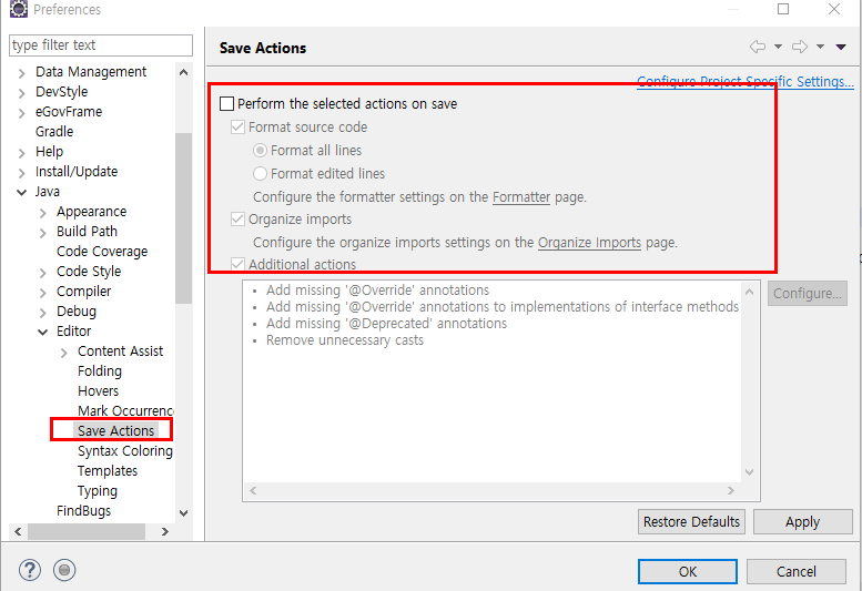 이런 코딩 스타일을 적용하기 전에 우선 이클립스에서 Save Actions 기능에 대해서 간략히 설명하겠습니다.