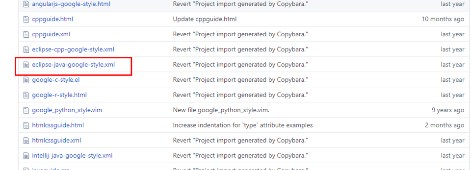 깃허브에 소스가 엄청 많지만 저희가 필요한 건 eclipse-java-google-style.xml 이거 하나입니다. (다른 소스 가이드는 나중에 해당 영역 개발에 필요하실때 적용하여보세요~)