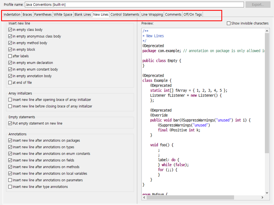 Java Conventions 가 오라클 자바 코딩 가이드에 맞춰서 설정되어진게 아닌가 추측이 되는데요.