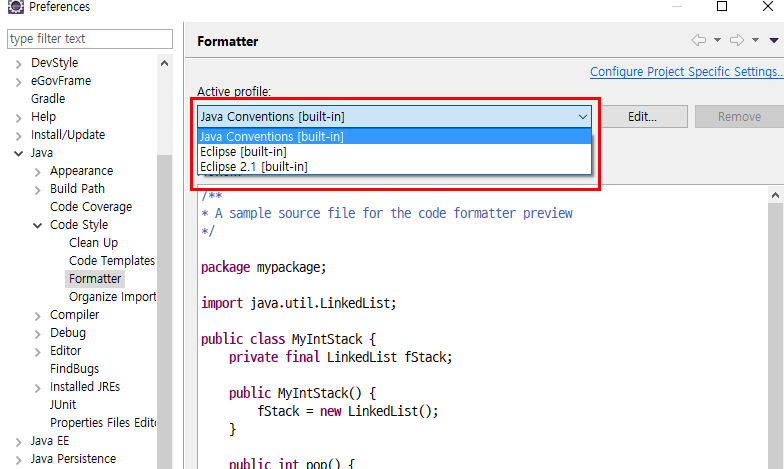 왼쪽부터 Java Conventions , Eclipse 기본설정, GoogleStyle 입니다.