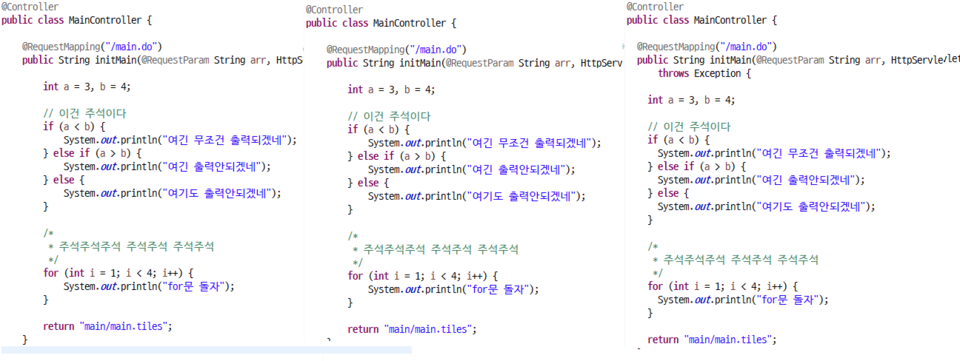 그리고 위처럼 소스를 표준코딩에 맞지 않게 엉망진창으로 작성했다고 본다면 저 상태에서 저장을 한다고 하더라도 일반적으론 소스가 자동 정렬되거나 하지는 않습니다. 이클립스에서 소스 자동 정렬 단축키는 Ctrl + Shift + F 이므로 해당 단축키를 눌러야 보기좋게 정렬될 것입니다. 하지만 저희는 아까 위에서 Format source code 옵션 적용을 했기에 위의 소스를 타이핑한 후에 Ctrl + S 만 눌러도 Ctrl + Shift + F 를 누른것과 동일하게 코드 가이드 설정에 맞게 코드가 자동 정렬된 것을 확인할 수가 있습니다. 아래처럼요.
