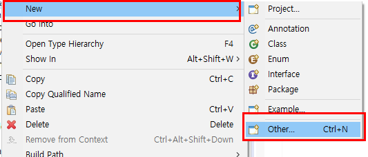 클래스 파일 생성하는 것처럼 적당한 경로의 패키지에서 오른쪽 버튼 눌러서 New -> Other를 눌러주세요.