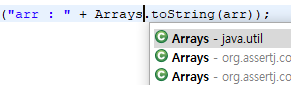 패키지경로를 다 기억을 못하겠다 하신다면.. Arrays에 커서를 대시고 ctrl + space를 누르면 패키지 경로를 확인할수가 있습니다.