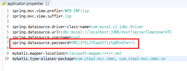 암호화된 값을 복사해서 application.properties의 password 입력란에 넣어줍니다. 값을 넣을때는 암호화된것이라는 알려주기 위해서 ENC()로 감싸줍니다. 나중에 복호화를 진행할 때, ENC()로 감싸준것만 복호화가 진행되기 때문입니다.