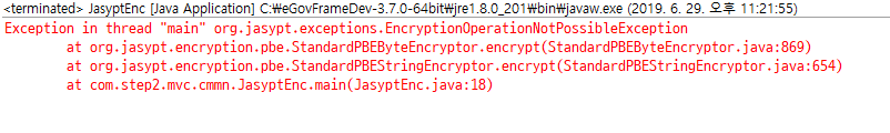 jasypt 라이브러리가 스프링 및 스프링부트, jre 버전에 워낙 민감한(?) 라이브러리인지라 정상적으로 코딩한것 같은데 오류가 난다면 버전 지원 문제일 확률이 큽니다. 그럴 경우 한 단계, 두 단계 낮은 구버전으로 내리시면 됩니다.