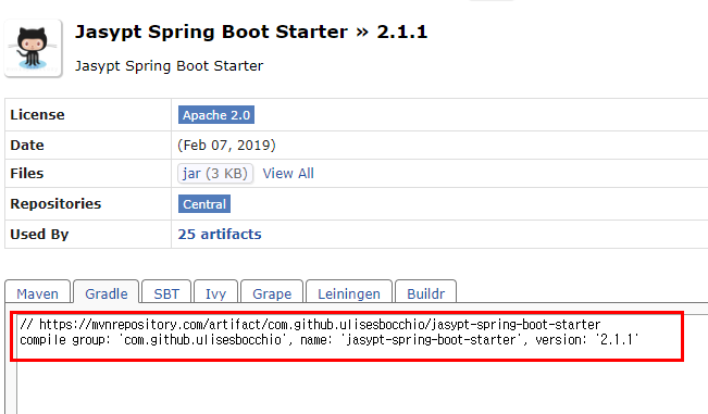 들어가서 메인 페이지 상단에 jasypt 로 검색합니다.