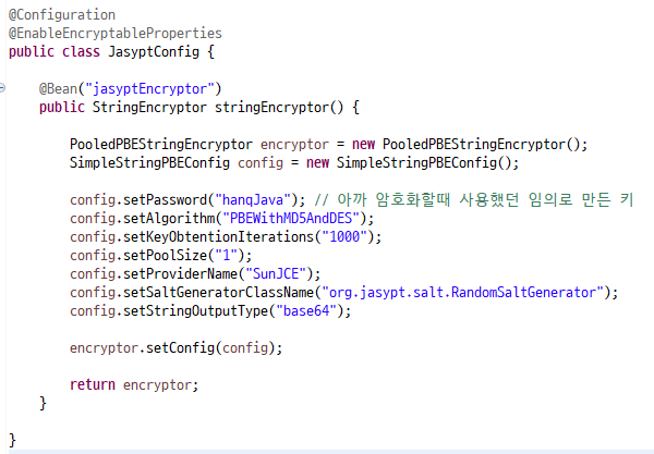 어떠한 알고리즘을 사용할지 먼저 설정을 해줘야하는데 저희는 MD5 암호화를 사용할거라서 PBEWithMD5AndDES 라고 입력을 해줍니다. 이 이외에도 지원하는 암호화 알고리즘이 많이 있는데(MD2, SHA, SHA-256 등) 이 부분은 jasypt 홈페이지를 참고하시면 자세히 알 수 있습니다.