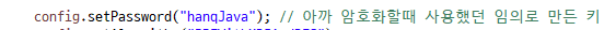 그리고 저는 패스워드를 hanqJava로 설정했는데요. 패스워드는 임의로 정하면 되지만, 이 패스워드는 나중에 암호화된 값을 다시 복호화할때 적용해야할 필수 Key이기 때문에 절대 잊어버리시면 안됩니다.